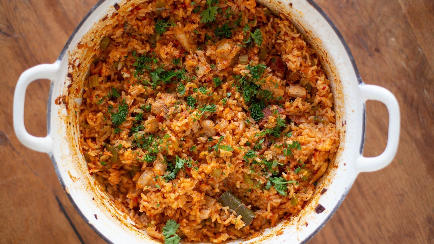 Jambalaya is een klassieker uit de Amerikaanse provincie Louisiana en ontleent zijn naam aan de combinatie van het Franse jambon (ham) en het Afrikaanse laya (rijst). Het is een soort rijstgerecht net als paella, waarbij je met groenten (paprika, bleekselderij, ui), worst, kip en /of garnalen, tomaten, rijst, bouillon en Cajun specerijen een heerlijk eenpansgerecht maakt met die typische Cajun/Creoolse smaak.