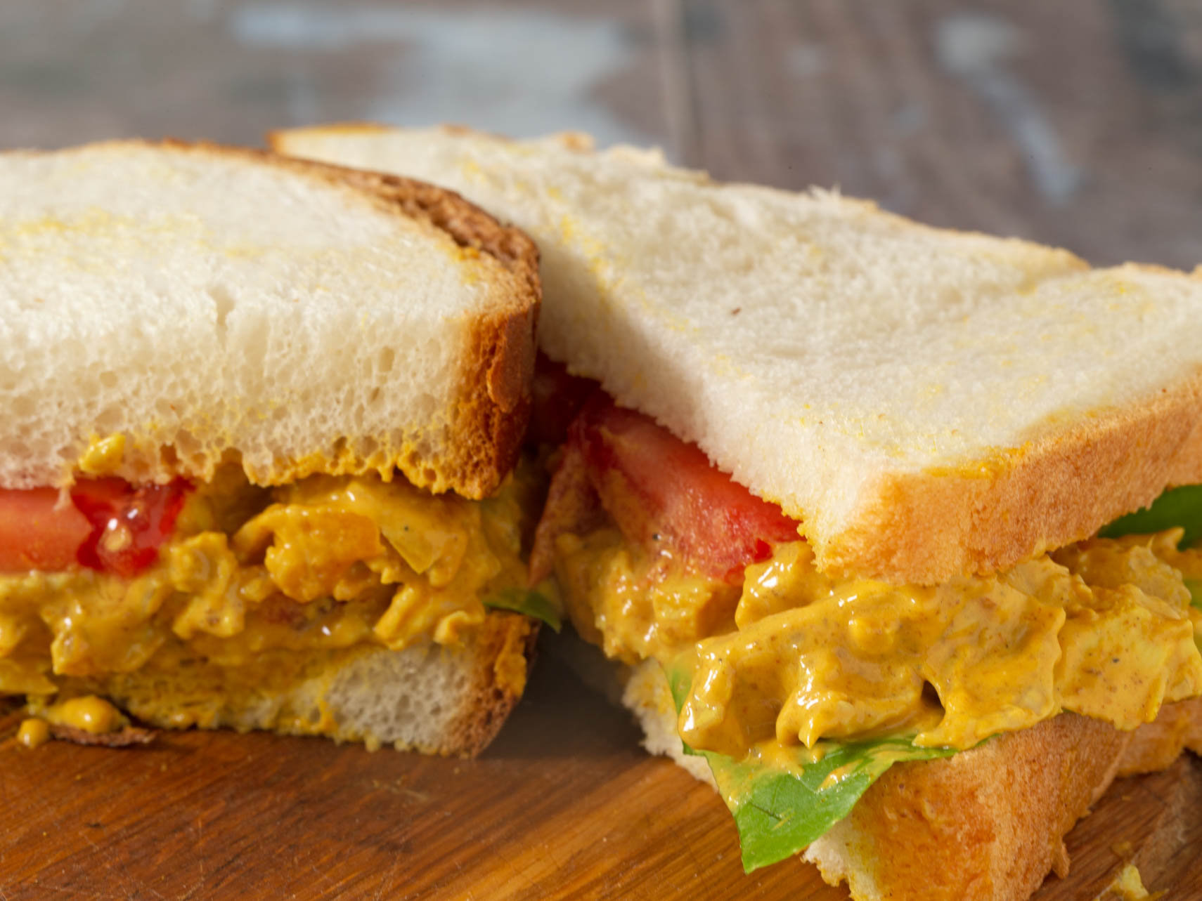 De eerste twee kipsalades zijn heel “crunchy” en passen heel goed op volkorenbrood of harde broodjes / stokbrood. Deze kipkerrie salade doe je het beste op lekker vers en zacht witbrood (bijvoorbeeld een ouderwetse melk mik) en dan met een paar blaadjes sla en en schijfje tomaat :)