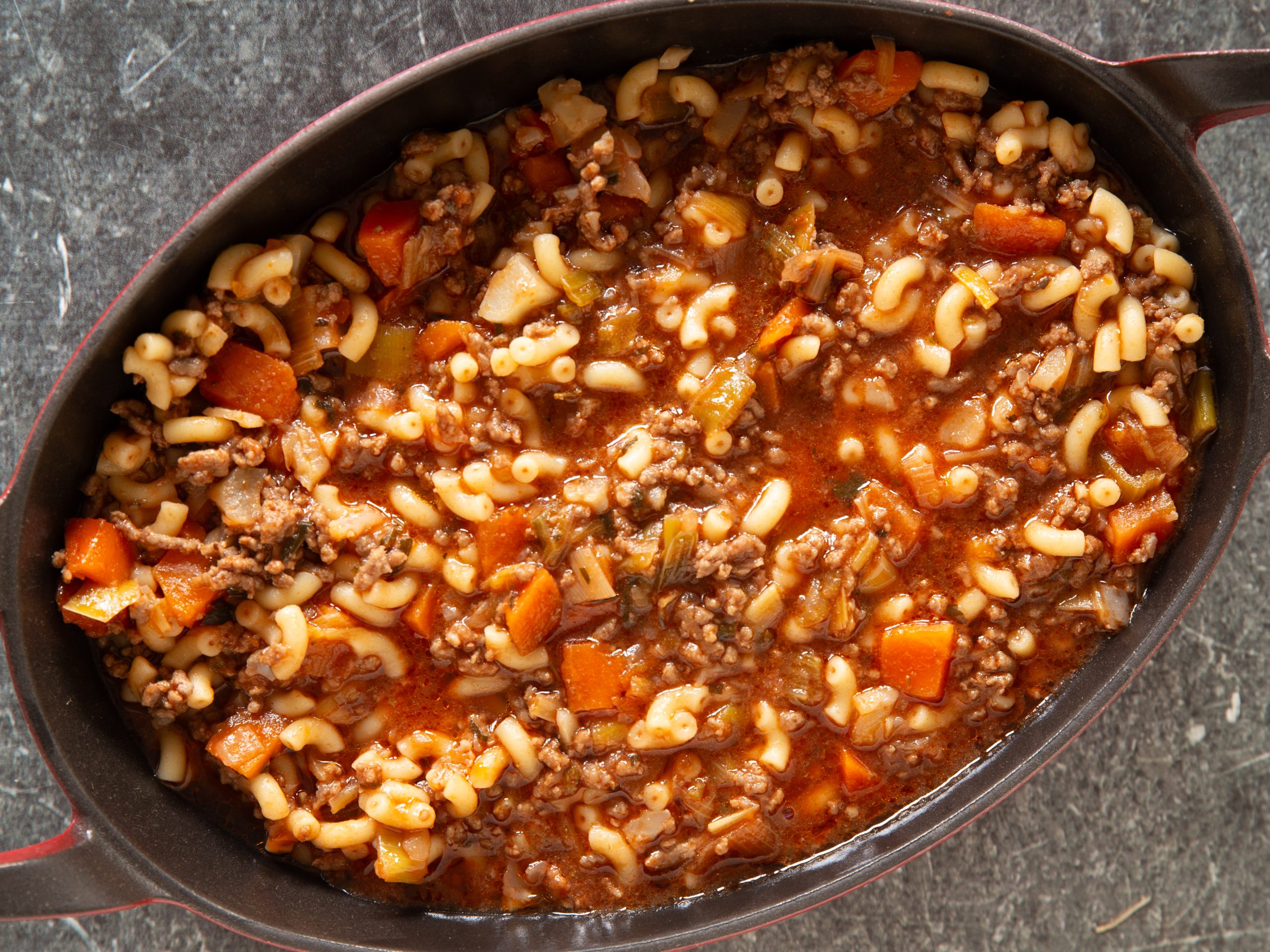 Hieronder het recept. Je kunt natuurlijk in plaats van tomato passata ook een paar blikken gepelde tomaten pureren en dan in de pan doen. Of in plaats van water met een paar bouillonblokken goede, zelfgemaakte runderbouillon nemen. Of in plaats van macaroni die oortjes van De Cecco in de pan doen. Maar dit is de versie die ik met enige regelmaat doordeweek maak.