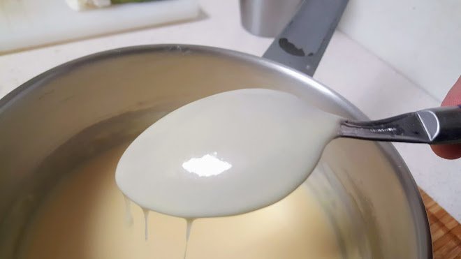 - Laat nu het boter/bloem mengsel circa 4 minuten zachtjes laten stoven, al roerend. Als de kleur lichtblond is dan is het ok, de roux mag niet bruin worden. Laat dan de roux even afkoelen om klontjes te voorkomen.