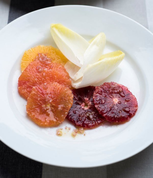 Volgens David Tanis van de New York Times is einde winter de beste tijd voor mooi citrusfruit. Hij combineert dat met witlof en maakt er zo een leuke salade van. Bijvoorbeeld Boeuf Bourguignon. En dan bedoel ik niet een salade als bijgerecht maar een salade NA het hoofdgerecht, om zoals ze wel zeggen “cleanse the palate”.