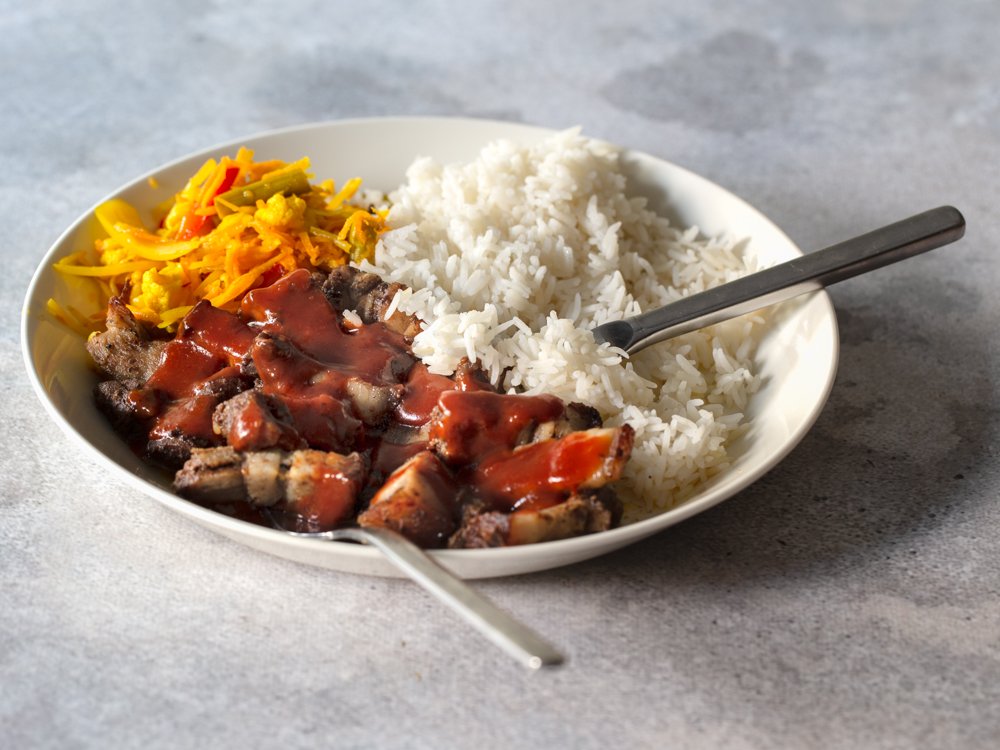 Deze maand weer eens babi pangang gemaakt. En daarbij eindelijk eens een foto gemaakt van het eindresultaat: het gemarineerde en geroosterde varkensspek, de babi pangang saus en mijn zelfgemaakte Atjar Tjampoer. Wat betreft de bereiding van het spek heb ik niks meer veranderd.