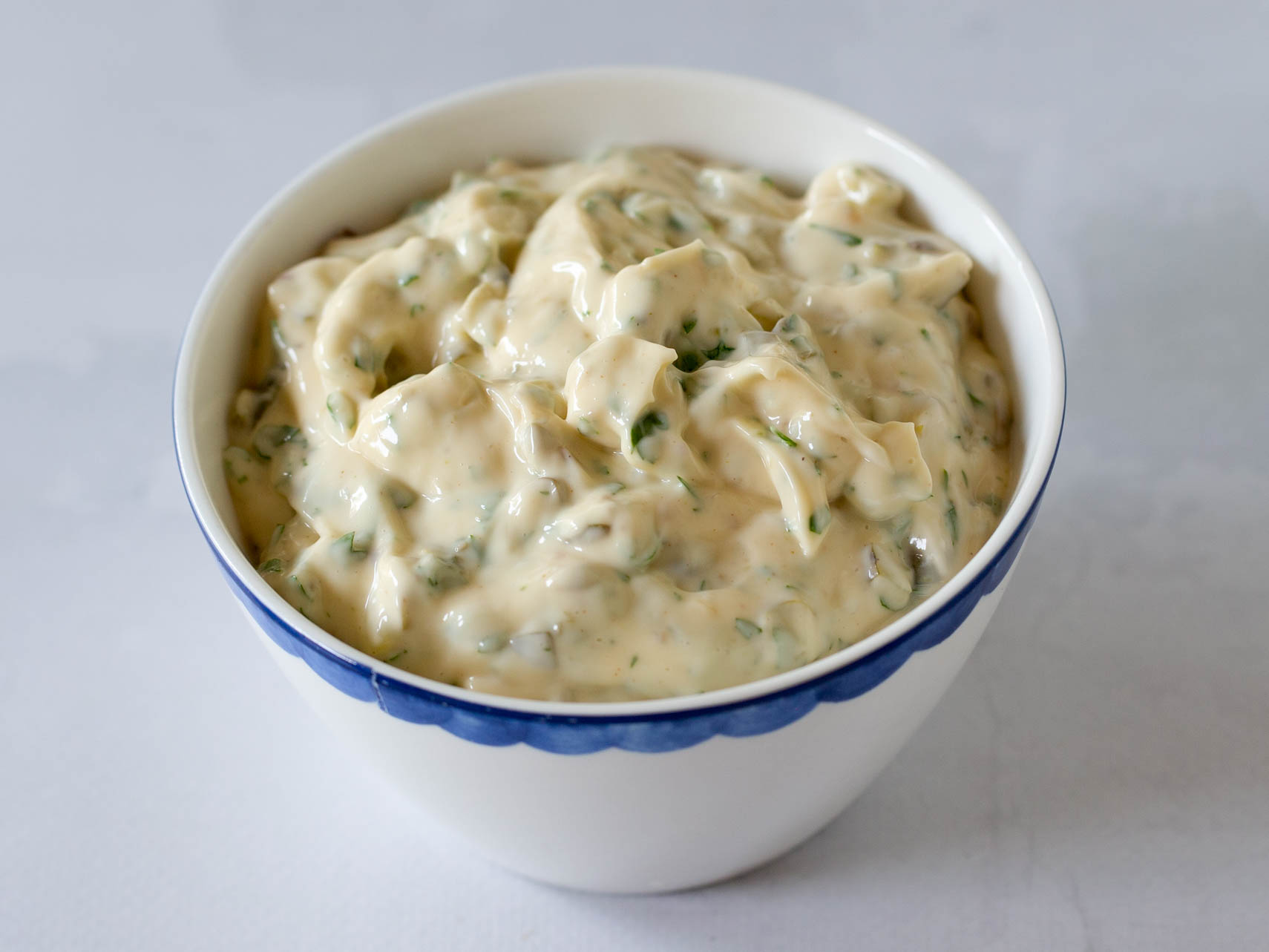 Remouladesaus laat zich makkelijk maken door wat augurk, kappertjes, ansjovis, mosterd en verse kruiden aan mayonaise toe te voegen.